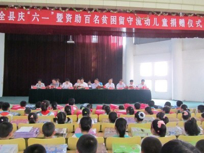 為幫助農(nóng)村貧困留守流動兒童繼續(xù)學(xué)業(yè),努力營造關(guān)愛貧困兒童健康發(fā)展的良好環(huán)境,2011年5月31日,沂水縣婦聯(lián)在第三實驗小學(xué)舉行了全縣慶“六一”暨資助百名貧困留守流動兒童捐贈儀式, 儀式現(xiàn)場向30名留守流動兒童代表各發(fā)放500元資助金、書包及食品。這次活動全縣有170余名貧困留守流動兒童接受愛心人士資助,資助金額達(dá)10萬余元。魯洲集團(tuán)一次就結(jié)對資助了102名貧困留守流動兒童。