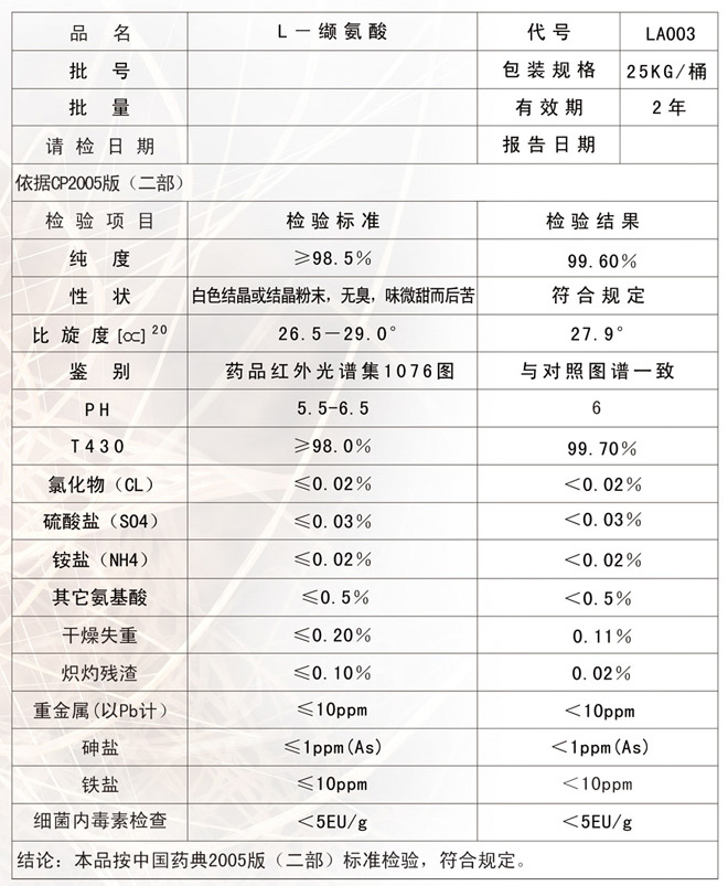 本品為白色結晶或結晶性粉末;用乙醇水溶液重結晶者為無色板狀或磷片狀結晶。無臭,有特殊苦味。熔點約315度。5%水溶液的PH值為5.5-6.5.對熱、光及空氣穩定。易溶于水(8.85g/100ml,25度),幾乎不溶于乙醇和乙醚.與亮氨酸的分離困難。比旋度為+26.5°至+29.0°